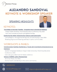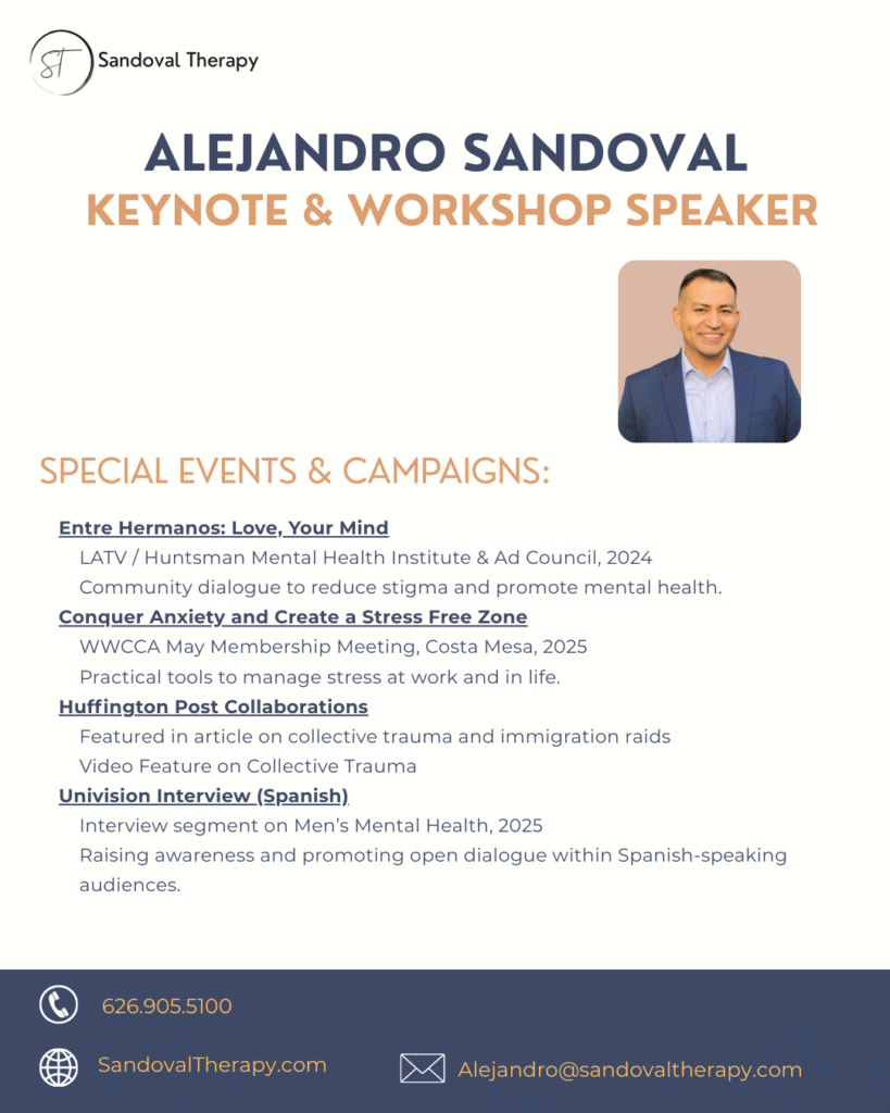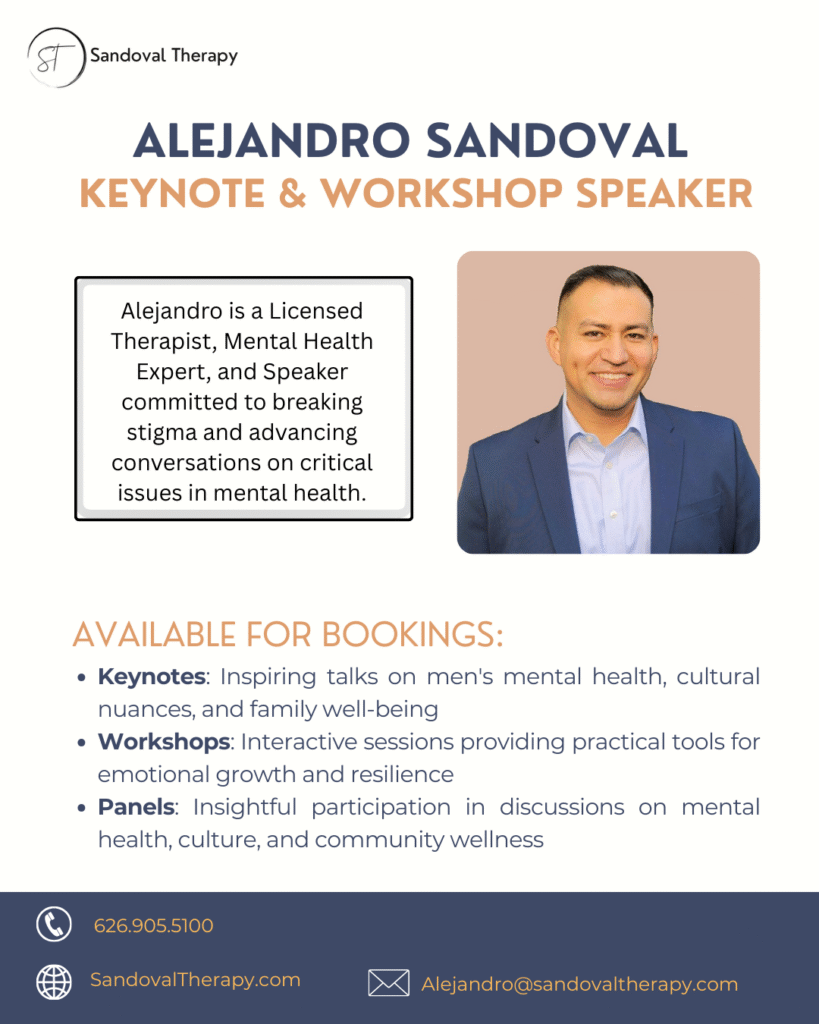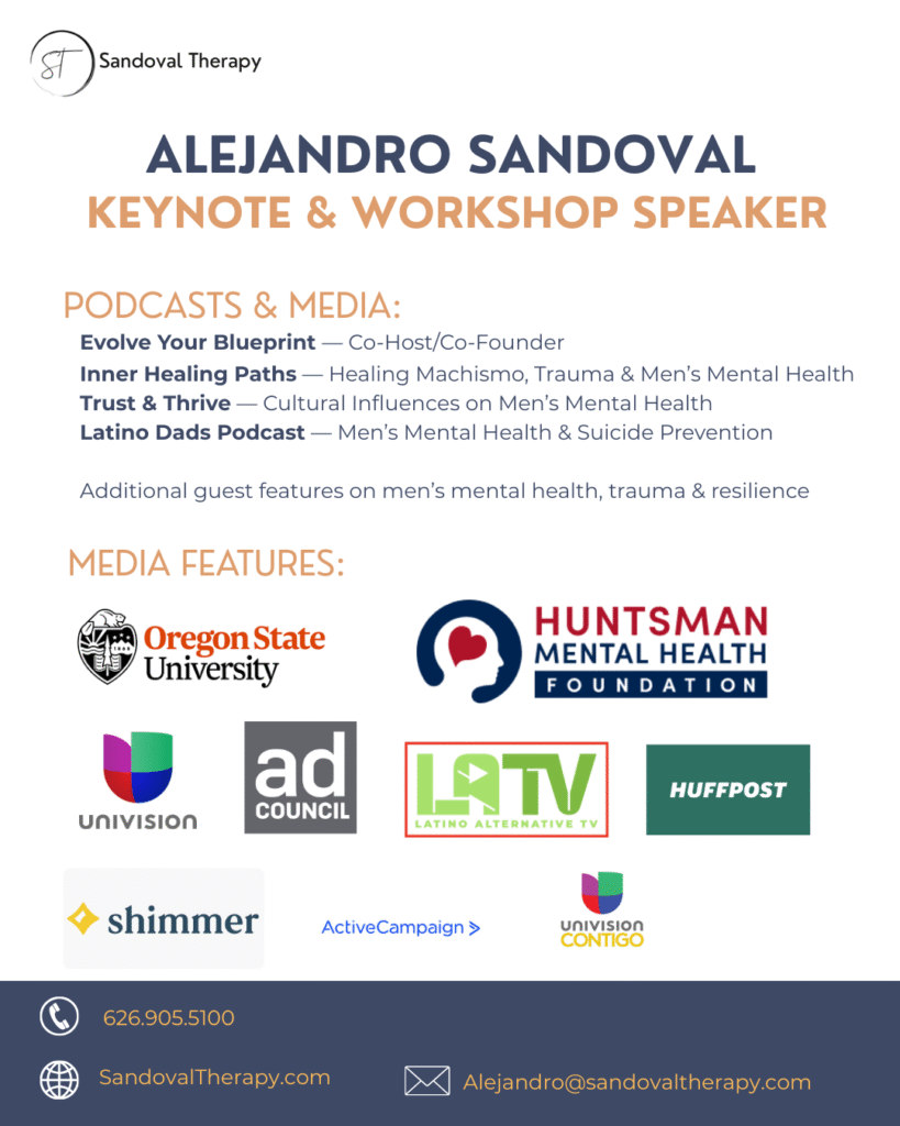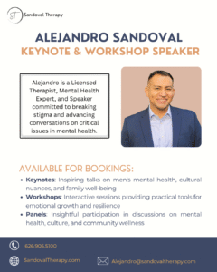 Alejandro (Alex) Sandoval, LMFT is a licensed psychotherapist, mental health advocate, and sought-after speaker specializing in men’s mental health, trauma healing, and relationships. Drawing from his extensive clinical experience and deep understanding of cultural trauma, emotional intimacy, and connection, Alejandro delivers engaging, insightful, and transformative talks designed to dismantle mental health stigmas, promote vulnerability, and inspire meaningful change — especially for men and the communities that support them.