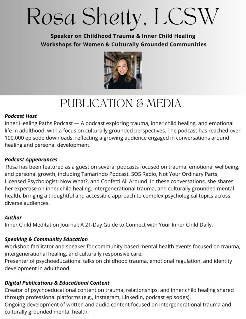 Rosa Shetty, LCSW, is a trauma-focused psychotherapist, speaker, and author whose work centers on the long-term impact of childhood and intergenerational trauma in Latinx/Hispanic communities, with a particular focus on women. As the daughter of Mexican immigrant parents and a first-generation professional, her perspective is deeply shaped by lived experience, navigating identity, belonging, and emotional life across cultures.