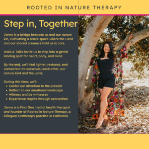 🌱 ¡Hola y bienvenida/o! I’m Jenny Lopez, LCSW (she/her/ella) — a bilingual Licensed Clinical Social Worker and the founder of Rooted in Nature Therapy™, a mental health practice grounded in the belief that caring for ourselves and caring for the Earth are deeply interconnected. I provide telehealth therapy (phone and video) and in-person sessions (office and outdoor Walk & Talks) in local parks throughout the San Fernando Valley in Los Angeles, CA. Sessions offer space to pause, reconnect, and restore emotional balance through a nature-guided and relationship-centered approach.