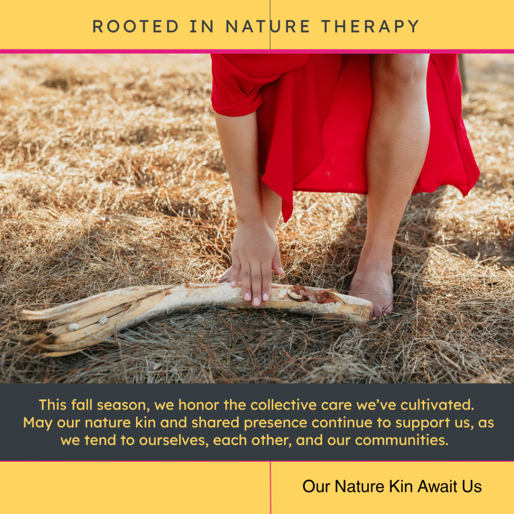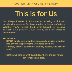 At Rooted in Nature Therapy, we view wellness as a shared journey — not something to achieve alone, but something we co-create in connection with others and the natural world around us. Therapy becomes a place for restoration and reflection, where we can explore the ways you relate to yourself, to others, and to the land that holds you. You might find yourself grounding through breathwork, exploring stories from your family lineage, or connecting to the rhythms of nature as metaphors for your own growth and change.