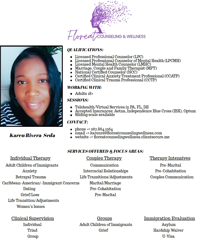 Greetings! My name is Karen Rivera-Seda and I am a Jamaica born 1.5 Generation American. I am a licensed therapist who is trained in marriage, couples, and family therapy as well as certified in both anxiety and trauma.